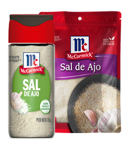 Sal marina en grano, pimienta negra, ajo en escamas, cebolla en escamas, pimienta roja, paprika y perejil.