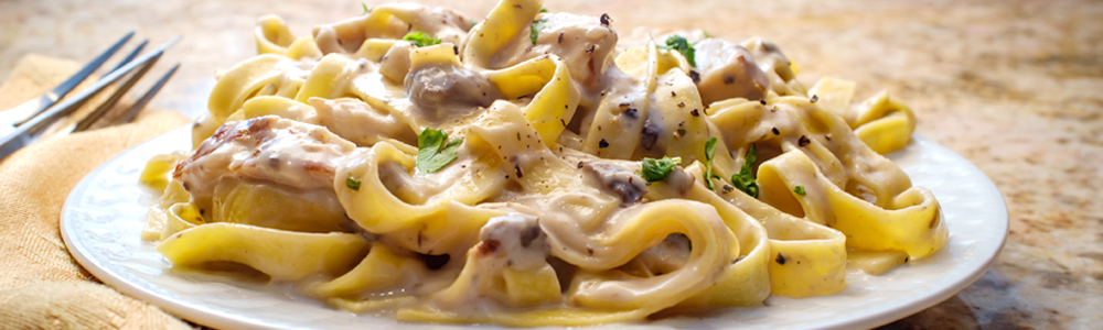 Luego, cocinar el fetuccine en una olla con abundante agua y sal. Mientras tanto, picar la cebolla en cuadritos y fríela en una sartén hasta que esté crujiente. Asegurarse de que esta sea grande para que pueda contener el fetuccine.