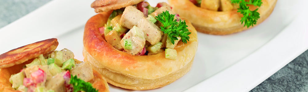 Rellenar las canastas con la preparación del pollo y adornamos con una hoja de perejil.
